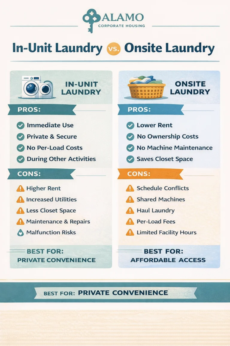 If you live life on the go and want to save time, add convenience, and keep your daily to-dos moving, in-unit laundry should be a priority for choosing the right apartment. Apartments with a washer and dryer hookup will have a higher rent and slightly increased utility costs, but you’ll never regret the peace of mind you gain from fewer trips to the onsite laundry or laundromats. If you need help finding the best apartments with in-unit laundry in Texas, contact Alamo Corporate Housing. We provide month-to-month furnished apartments in San Antonio, Austin, New Braunfels, Corpus Christi and more.